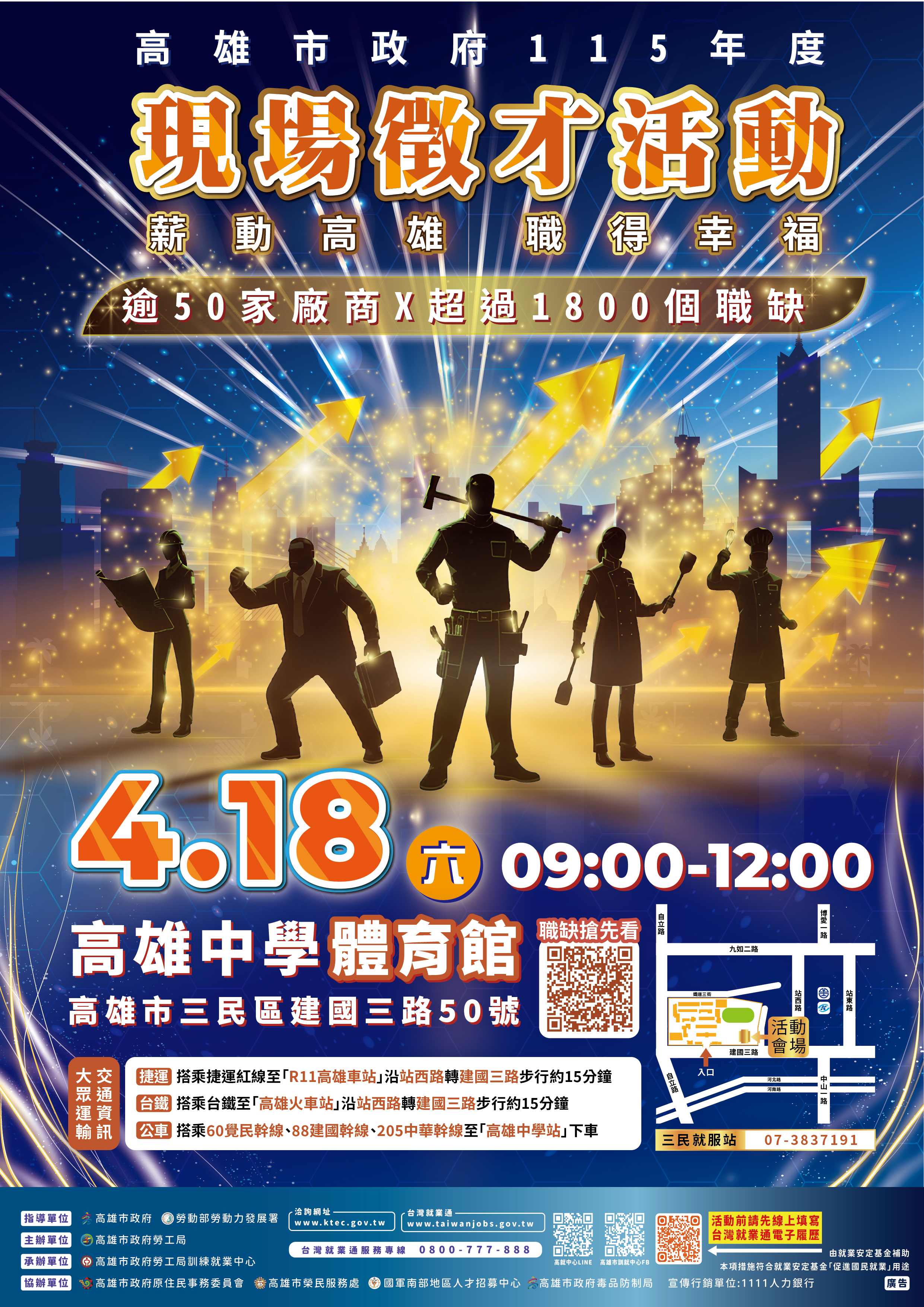 勞工局115年4月18日(六)在「高雄中學體育館」辦理大型現....